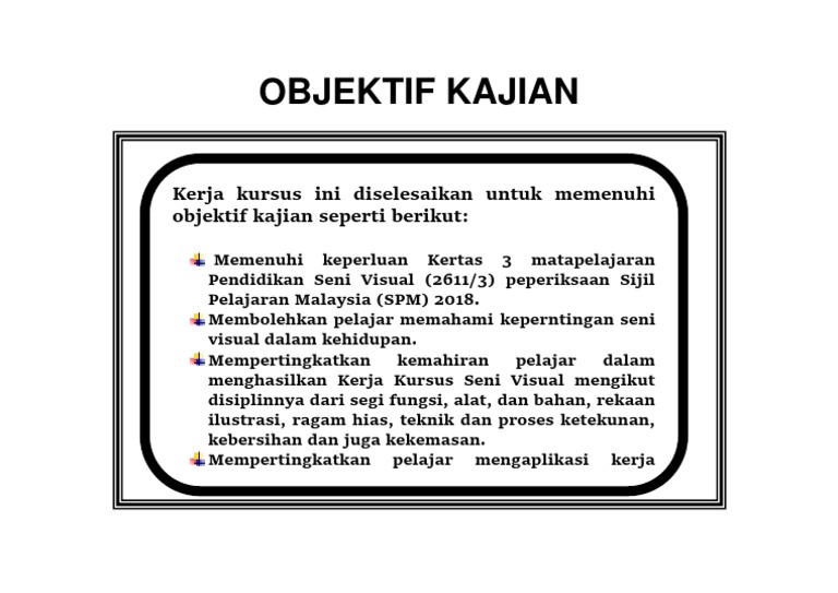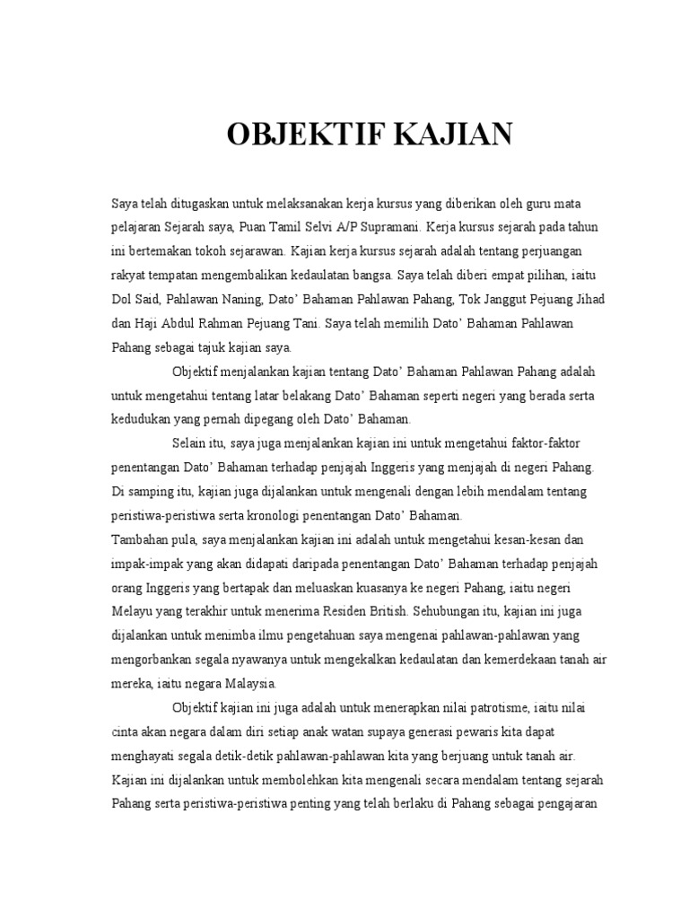 Mengenalpasti tahap kebimbangan luaran atlet tinju sukma johor sebelum dan selepas hari perlawanan. Objektif kajian ini adalah untuk melihat kekerapan dan peratusan. Pengisytiharan melaka sebagai bandaraya bersejarah 6. Objektif kajian (写你做的题目 / 从里面学到的价值观) sample 1 kajian sejarah ini amat bermakna sekali untuk saya dan kajian ini telah dilaksanakan bagi memenuhi beberapa objektif iaitu: Adakah intervensi inklusif sukan dapat mengubah tingkah laku negatif dan